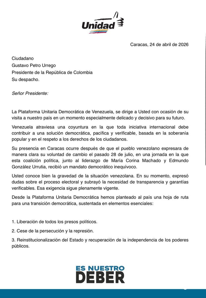 Por ello, aseguró que espera que la visita de Petro «ayude a fortalecer el derecho de los venezolanos a vivir en libertad, con instituciones legítimas, elecciones libres y un horizonte de convivencia democrática».
