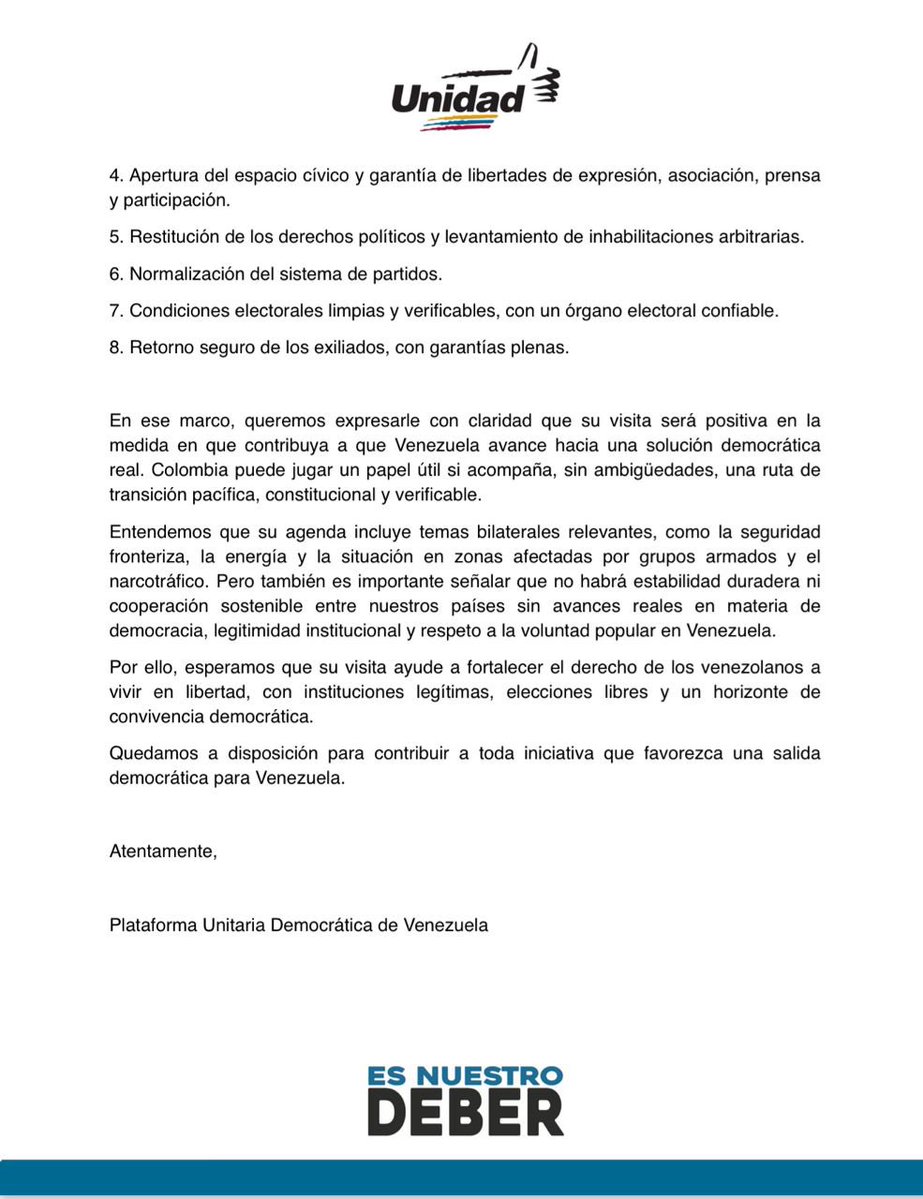 «Pero también es importante señalar que no habrá estabilidad duradera ni cooperación sostenible entre nuestros países sin avances reales en materia de democracia, legitimidad institucional y respeto a la voluntad popular en Venezuela», añadió el bloque opositor.