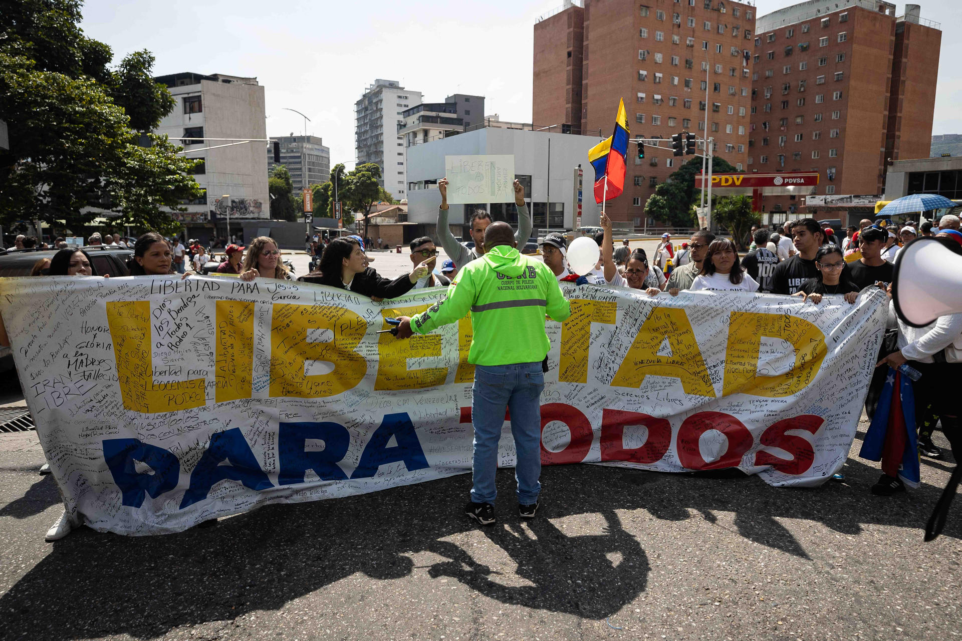 Familiares de presos políticos participan en una protesta alrededor de El Helicoide este sábado, en Caracas (Venezuela). Familiares de presos políticos en Venezuela calificaron como «show» la visita del presidente del Parlamento, Jorge Rodríguez, a una cárcel en Caracas, donde prometió la liberación de «todos» los detenidos el mismo día en que se apruebe la ley de amnistía, que estimó pasaría «entre el martes que viene y a más tardar el viernes» | EFE/Ronald Peña R