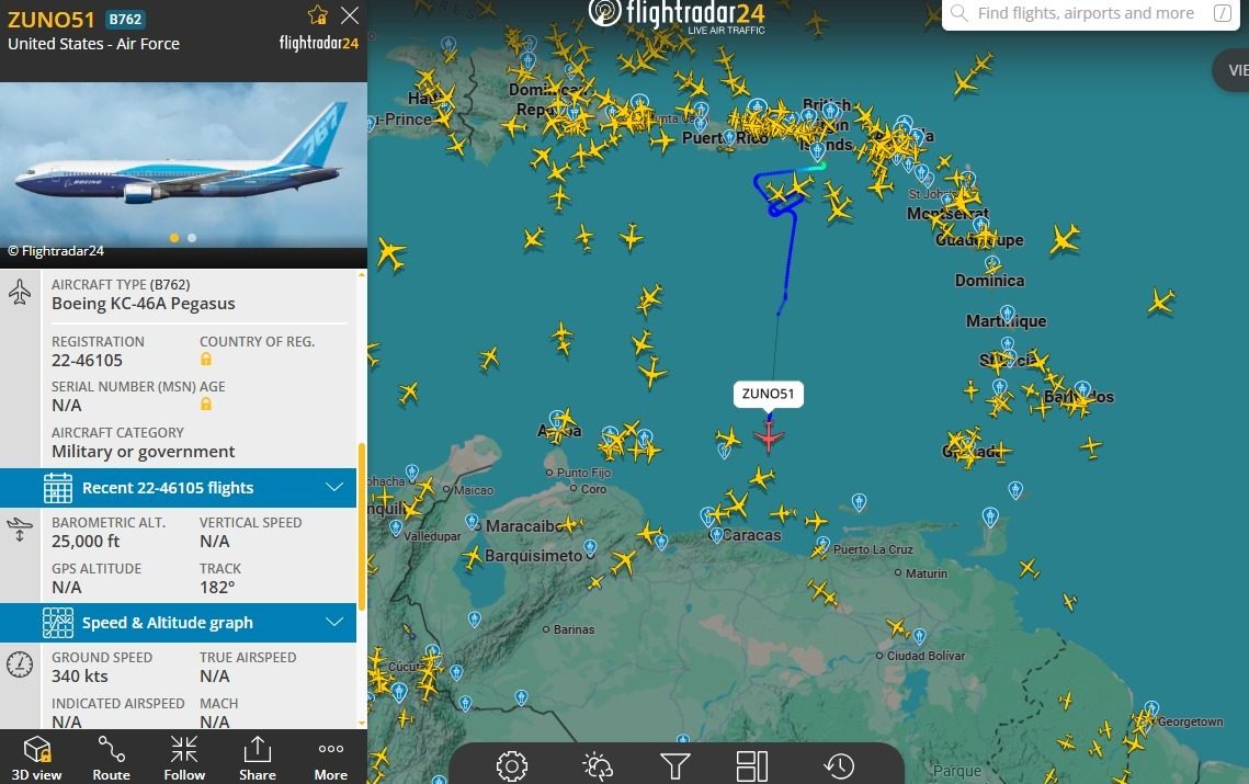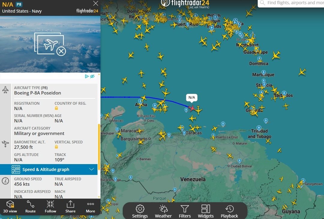 Sistemas de rastreo aéreo detectaron operaciones de dos aeronaves militares de Estados Unidos al norte de Maiquetía, en el estado Vargas. El despliegue de los aviones pertenecientes a la Fuerza Aérea y la Armada estadounidense ocurrió sobre aguas del mar Caribe, cerca del espacio aéreo venezolano.