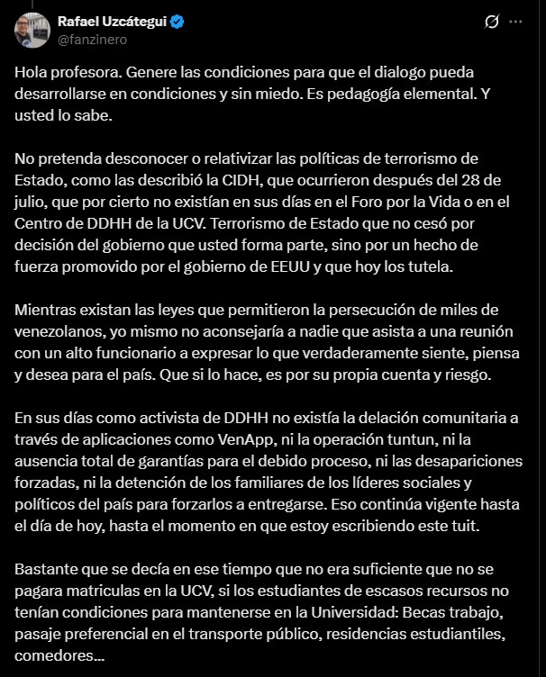 A través de un intercambio en la red social X, Uzcátegui sostuvo que antes de hablar de acuerdos es necesario crear garantías reales para que profesores, estudiantes y trabajadores puedan expresarse libremente. “Genere las condiciones para que el diálogo pueda desarrollarse en condiciones y sin miedo. Es pedagogía elemental”, escribió.