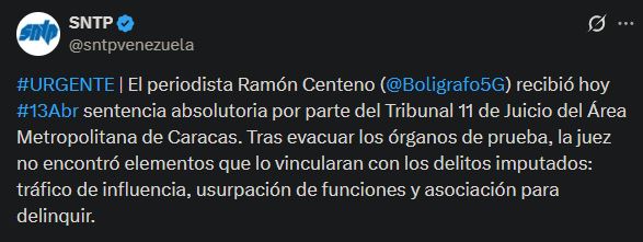 El Sindicato Nacional de Trabajadores de la Prensa (Sntp) de Venezuela indicó en su cuenta de X que la decisión fue emitida tras la evacuación de los órganos de prueba presentados durante el juicio, luego de lo cual la jueza no encontró elementos que vincularan al comunicador con los delitos imputados de tráfico de influencias, usurpación de funciones y asociación para delinquir.