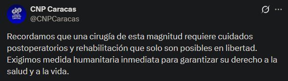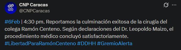 El Colegio Nacional de Periodistas, seccional Distrito Capital (CNP Caracas), informó en su cuenta de X que el procedimiento médico concluyó satisfactoriamente. Además, destacó la importancia de garantizar su derecho a la salud y a la vida mediante una medida humanitaria inmediata.