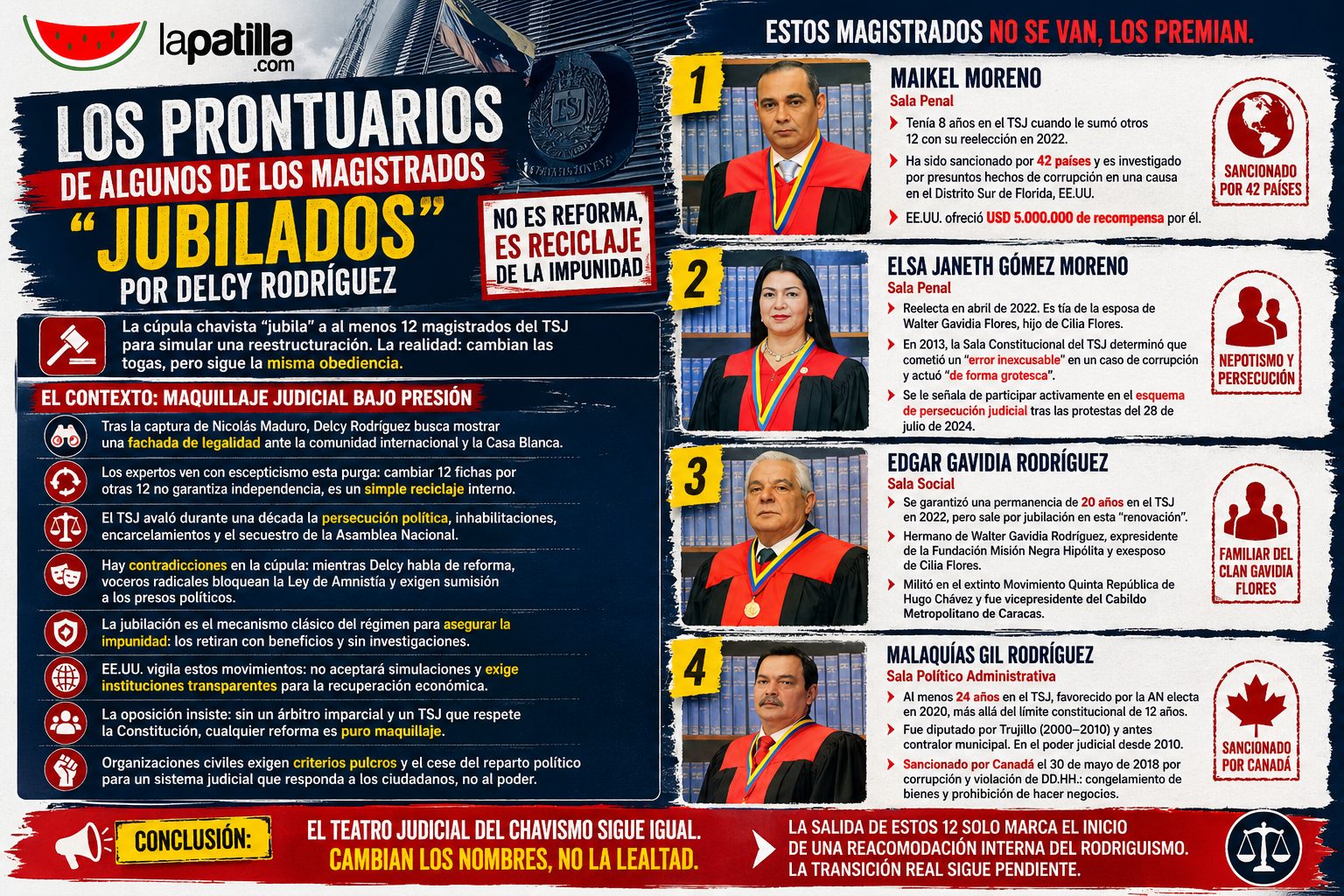 La cúpula chavista arrancó una aparente reestructuración del sistema de justicia con la inminente remoción forzada de al menos una docena de magistrados del Tribunal Supremo al servicio del régimen, mediante una maniobra disfrazada de jubilación ordenada por la sucesora de Nicolás Maduro, Delcy Rodríguez.
