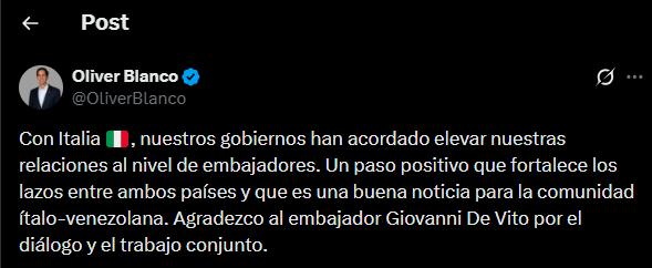 “Con Italia, nuestros gobiernos han acordado elevar nuestras relaciones al nivel de embajadores. Un paso positivo que fortalece los lazos entre ambos países y que es una buena noticia para la comunidad ítalo-venezolana”, escribió Blanco.