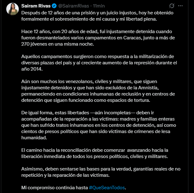 A través de su cuenta oficial en la red social X, Rivas aseguró que la decisión pone fin a “12 años de una prisión y un juicio injustos”, tras haber sido detenida cuando tenía 20 años durante el desmantelamiento de varios campamentos estudiantiles en Caracas.