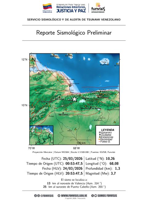 Un sismo de magnitud 3,7 sacudió la noche de este martes 24 de marzo a la ciudad de Valencia y sus zonas aledañas, con reportes ciudadanos que alertaron sobre la fuerte percepción del movimiento telúrico a través de diversas plataformas digitales.