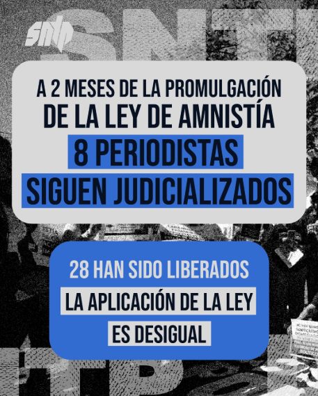 A dos meses de la promulgación de la Ley de Amnistía en Venezuela, el Sindicato Nacional de Trabajadores de la Prensa (Sntp) denunció, que ocho periodistas continúan judicializados y a la espera de un sobreseimiento definitivo de sus causas.