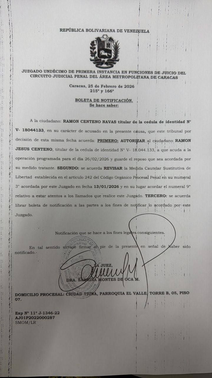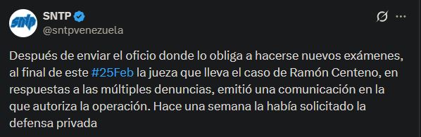 No obstante, el Sntp informó que la jueza Sabrina Montes de Oca, que lleva el caso contra Ramón Centeno, emitió una nueva comunicación en la que autorizó la intervención quirúrgica, luego de las múltiples denuncias públicas ante la decisión de solicitar una «nueva revisión médica» el mismo día de la cirugía.