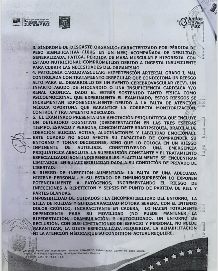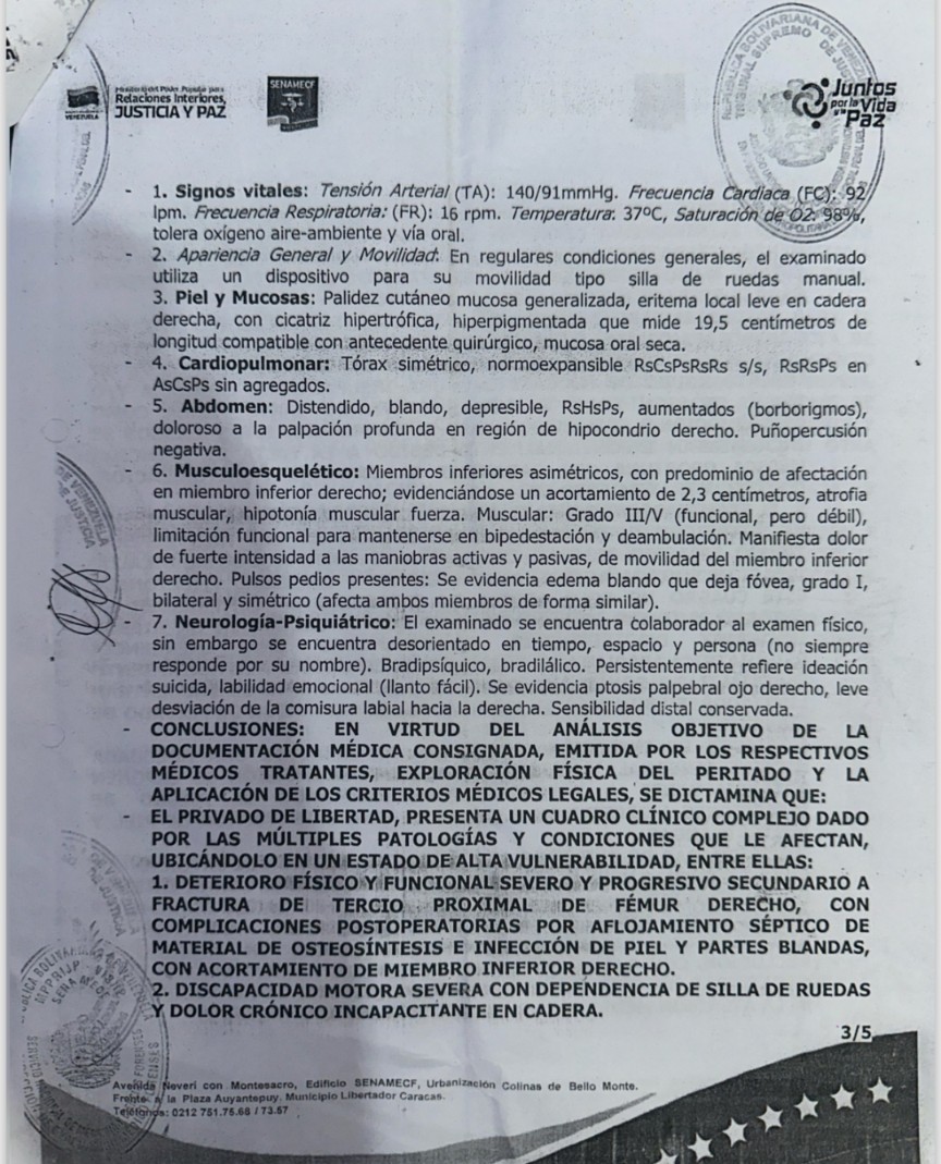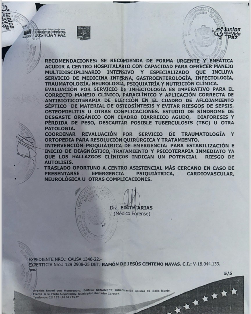 Asimismo, el Sntp difundió las conclusiones de los exámenes médicos practicados por el propio Senamecf y remitidos al tribunal, en los que se detalla la condición de salud de Centeno.