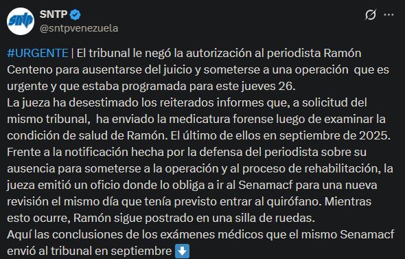 A través de una publicación en su cuenta en X, el gremio señaló que la jueza desestimó los informes médicos enviados por el Servicio Nacional de Medicina y Ciencias Forenses, los cuales habían sido solicitados por el propio tribunal tras evaluar la condición de salud del comunicador. El último de estos reportes fue consignado a mediados de septiembre de 2025.