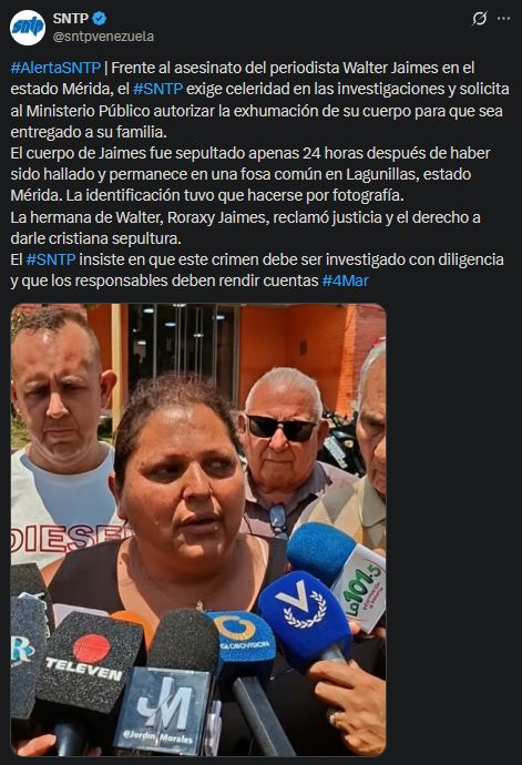 El Sindicato Nacional de Trabajadores de la Prensa de Venezuela (Sntp) reclamó este miércoles celeridad en las investigaciones por el asesinato del periodista Walter Jaimes, ocurrido en el estado Mérida, y solicitó al Ministerio Público autorizar la exhumación de su cuerpo para que pueda ser entregado a sus familiares.
