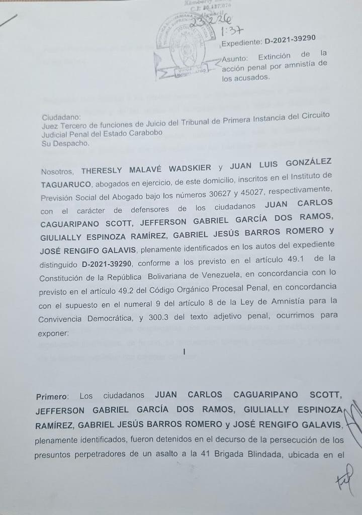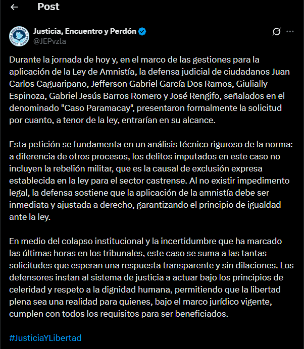 La ONG Justicia, Encuentro y Perdón (JEP) informó la tarde de este lunes 23 de febrero, que la defensa judicial de cinco ciudadanos vinculados al denominado Caso Paramacay consignó formalmente ante los tribunales la solicitud para la aplicación de la Ley de Amnistía.