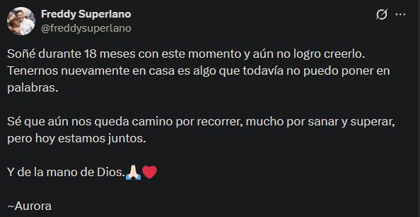 Aurora Silva reconoció que aún queda camino por recorrer y ahora lo harán juntos como antes. “Sé que aún nos queda camino por recorrer, mucho por sanar y superar, pero hoy estamos juntos. Y de la mano de Dios”, destacó.