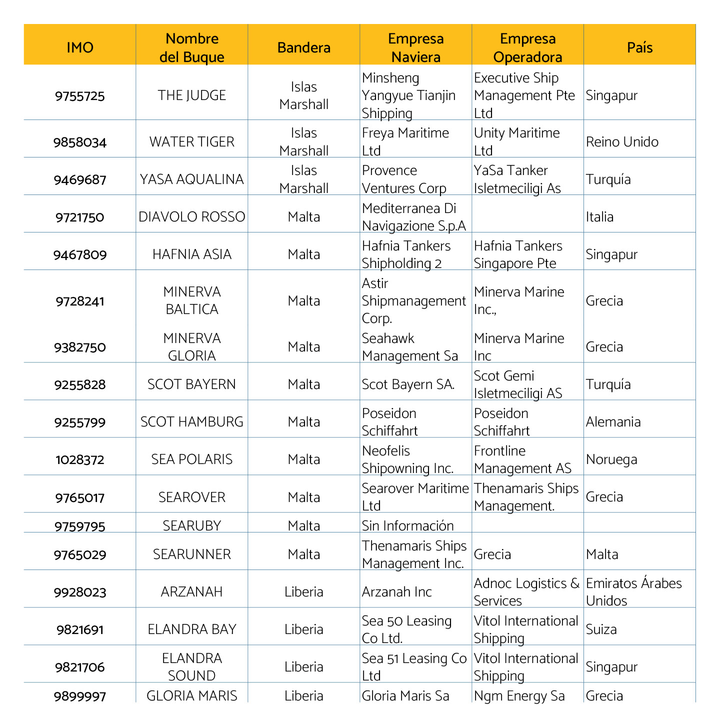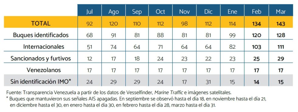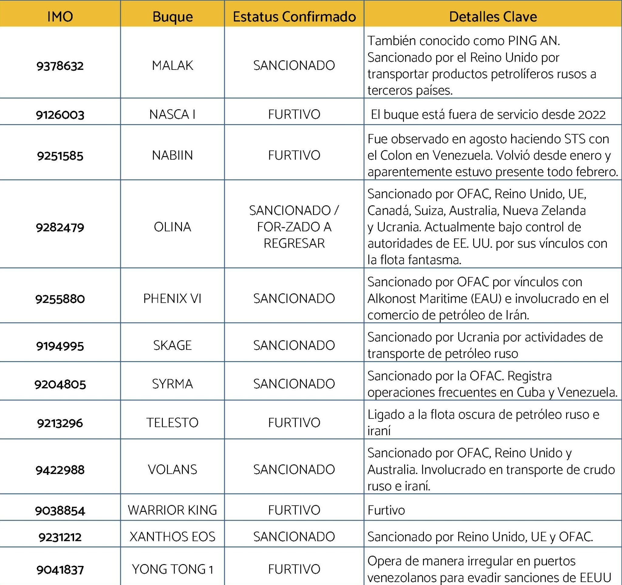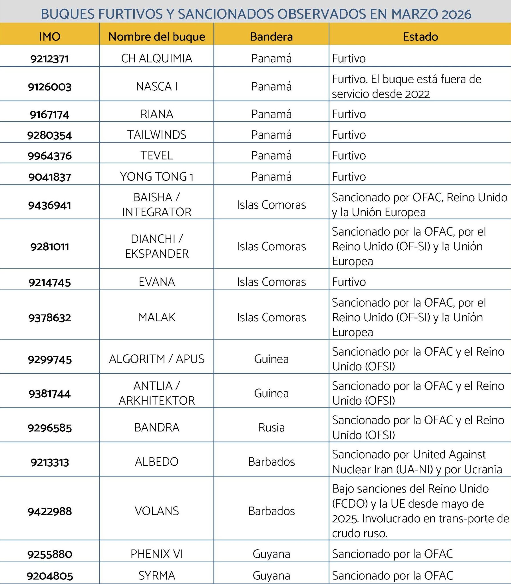 Como se detalla en el cuadro siguiente, este conjunto incluye 17 buques con bandera venezolana. Asimismo, se identificaron 25 embarcaciones sancionadas o de operación furtiva en febrero y 29 en marzo. En cuanto a las naves en “modo oscuro”, detectadas mediante imágenes satelitales, se contabilizaron 14 en febrero y 15 en marzo.