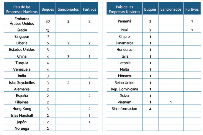 En cuanto a las banderas de los buques sigue siendo Panamá el país más importante con 28 embarcaciones registradas, seguido de Islas Marshall con 19 y Malta con 10.