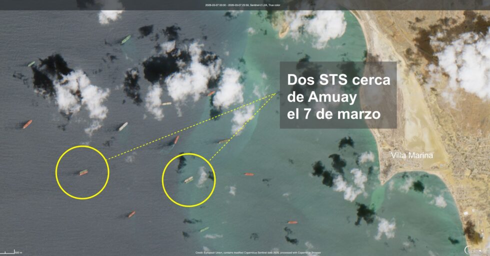 En lo que respecta a las prácticas de trasiego, en febrero se identificó sólo una operación el día 13, mientras que en marzo se observaron 4 STS (Ship-To-Ship o transferencia de barco a barco) en la zona de Caquetíos, próxima al puerto de Amuay en el estado Falcón, mismo lugar en donde ocurrieron operaciones irregulares en meses previos.
