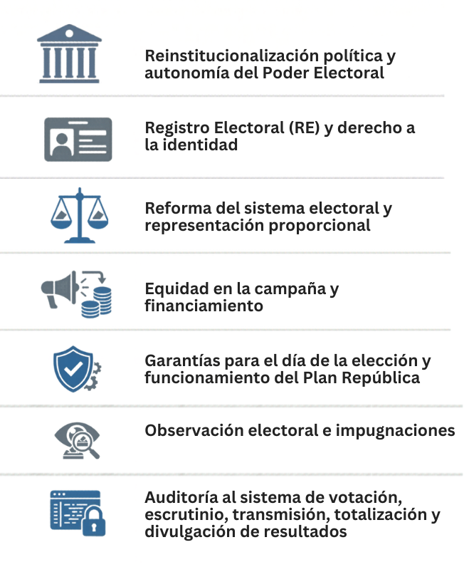En esta primera entrega se abordan las dos primeras áreas: la reinstitucionalización política y del CNE y la actualización del Registro Electoral.