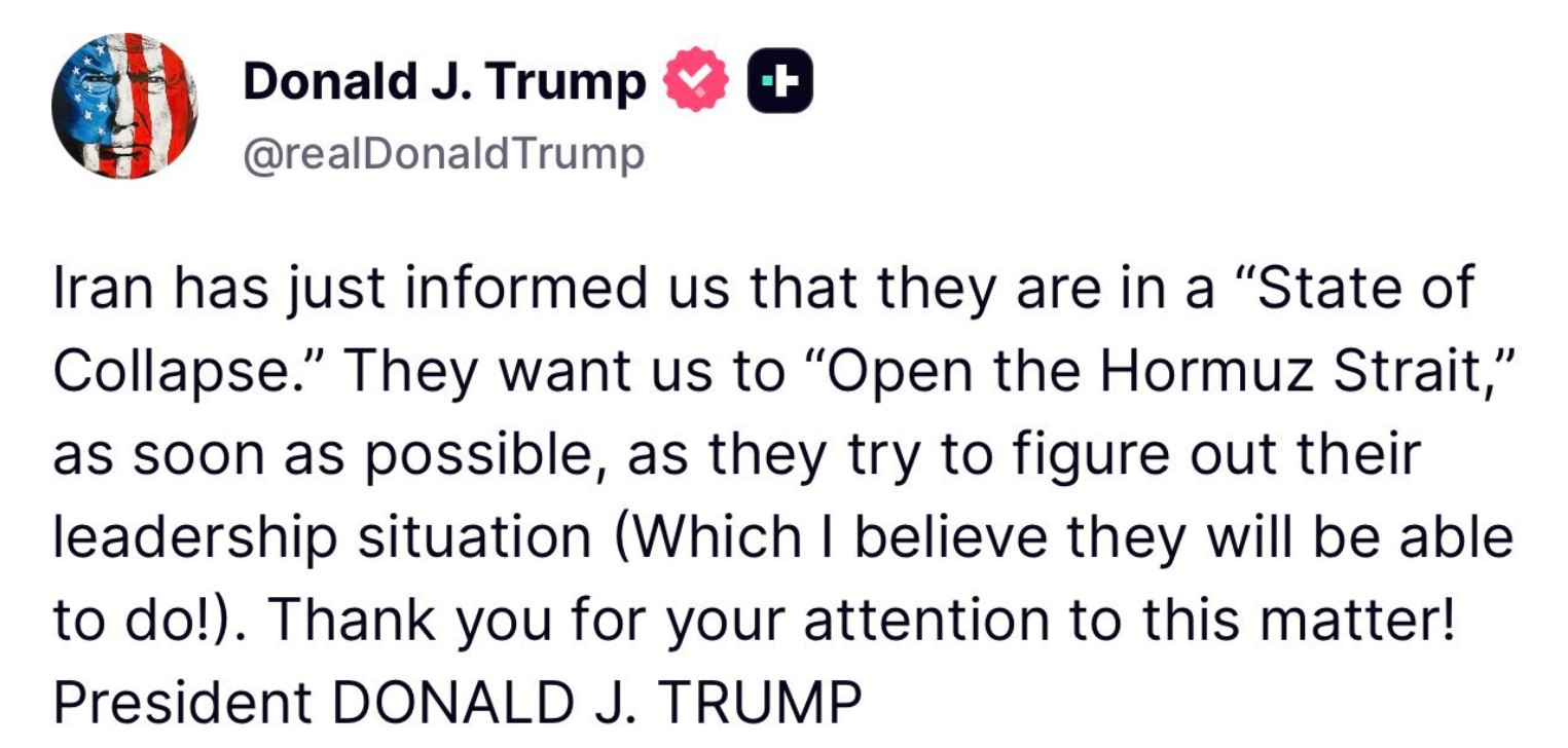 «Irán nos acaba de informar de que se encuentran en un ‘estado de colapso’. Quieren que ‘abramos el estrecho de Ormuz’ lo antes posible, mientras intentan resolver su situación de liderazgo (¡lo cual creo que lograrán hacer!)», escribió en su red Truth Social.