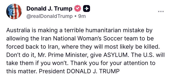 «Australia está cometiendo un terrible error humanitario al permitir que la selección nacional femenina de fútbol de Irán sea obligada a regresar a Irán, donde probablemente será asesinada. No lo haga, señor primer ministro, concédeles asilo. Estados Unidos los aceptará si no lo hace», dijo el mandatario en un mensaje publicado a través de su red social Truth Social.