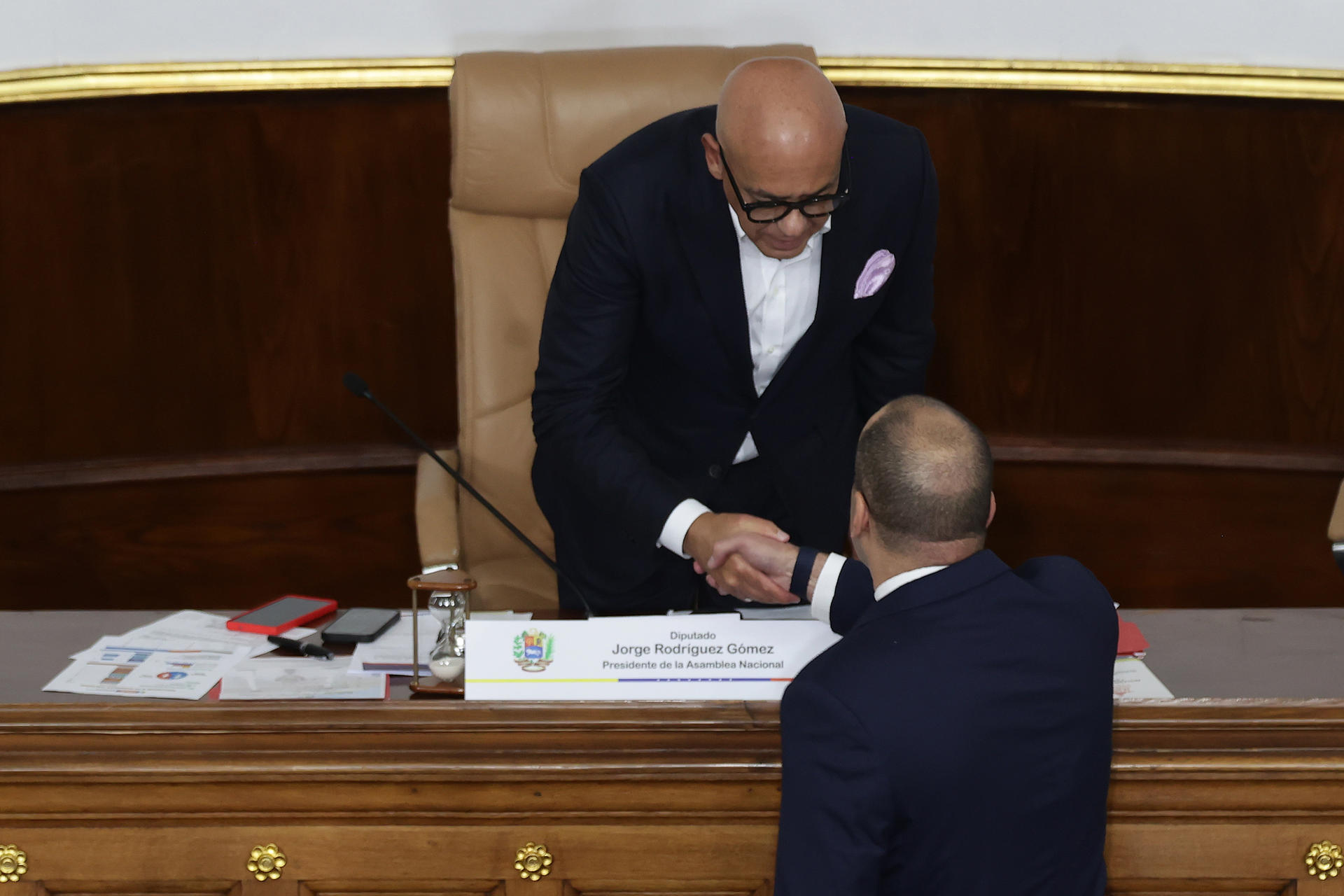 El abogado y colaborador cercano del chavismo Larry Devoe (d) estrecha su mano con el presidente de la Asamblea Nacional de Venezuela, Jorge Rodríguez, tras ser designado como nuevo fiscal general de Venezuela este jueves, en Caracas (Venezuela). EFE/ Ronald Peña R