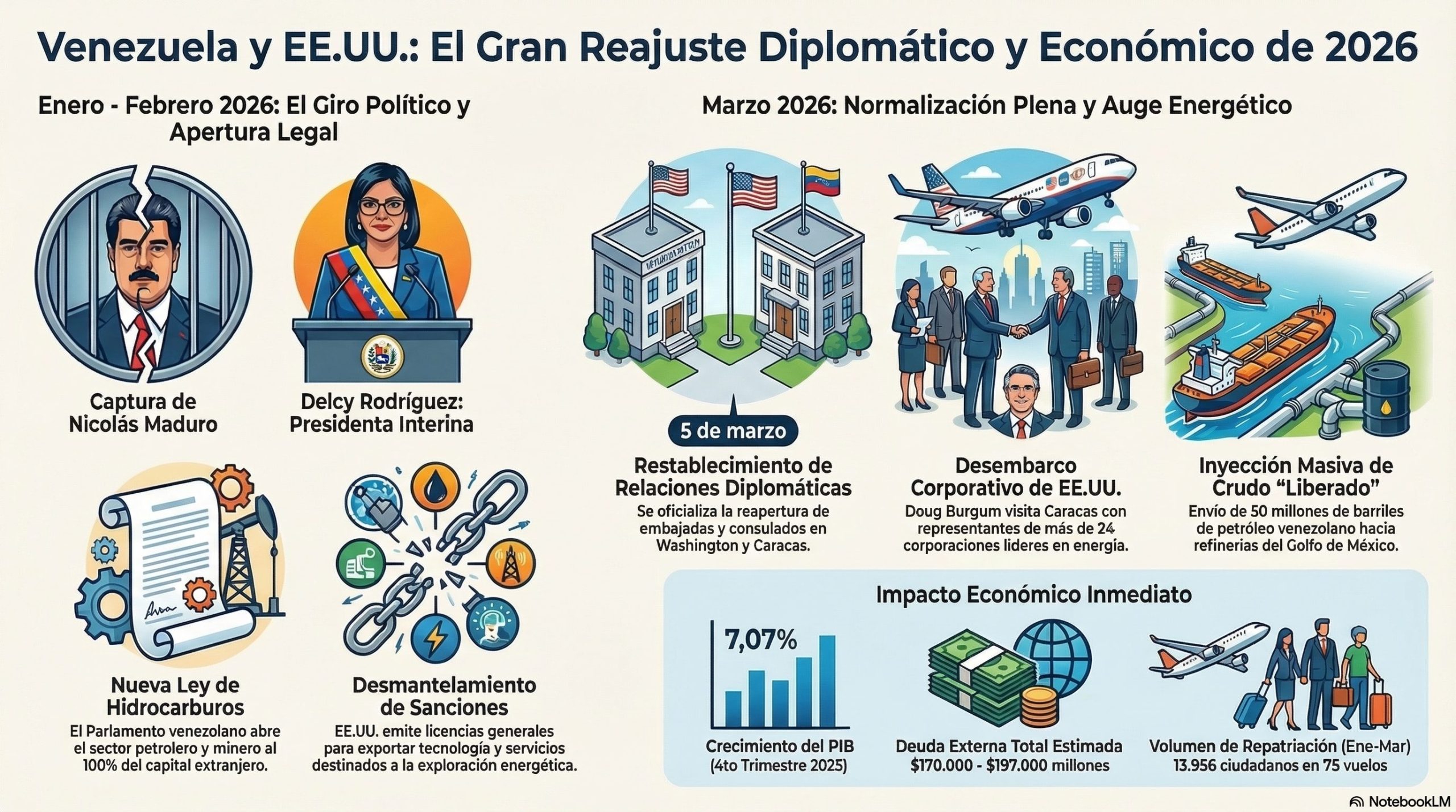 En 2026, la relación petrolera entre Estados Unidos y Venezuela experimentó un giro radical, pasando de un régimen de sanciones y ruptura diplomática a una intervención directa de EEUU y la reapertura total del sector al capital estadounidense tras la caída de Nicolás Maduro.