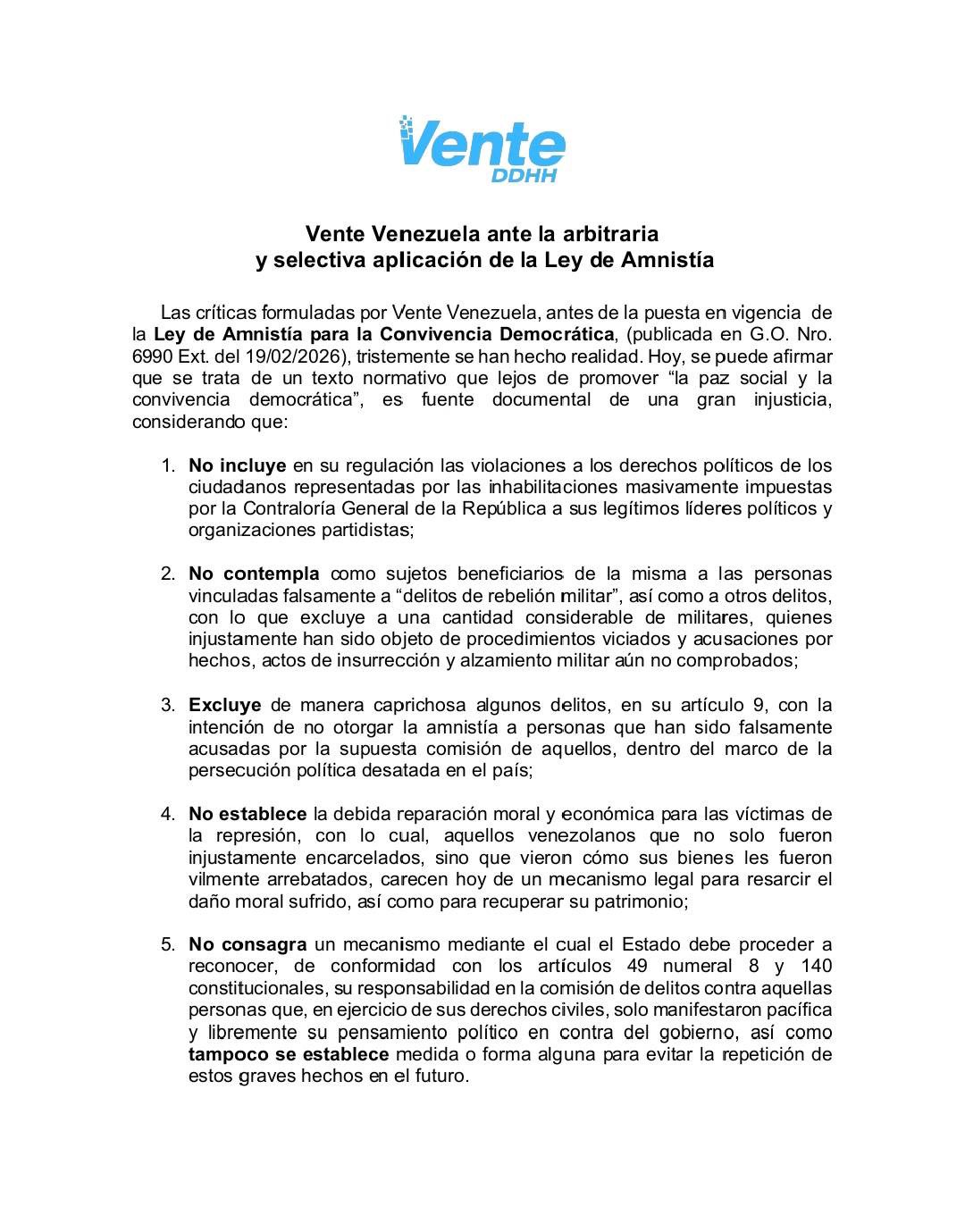 El Comité de Derechos Humanos de Vente Venezuela emitió este miércoles 18 de marzo, un contundente comunicado en el que denuncia la aplicación arbitraria y selectiva de la Ley de Amnistía, publicada en la Gaceta Oficial N° 6990 Ext. el 19 de febrero de 2026.