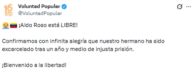 El partido político Voluntad Popular confirmó este domingo 8 de febrero la excarcelación de su dirigente Aldo Roso, quien permaneció privado de libertad durante un año y medio.
